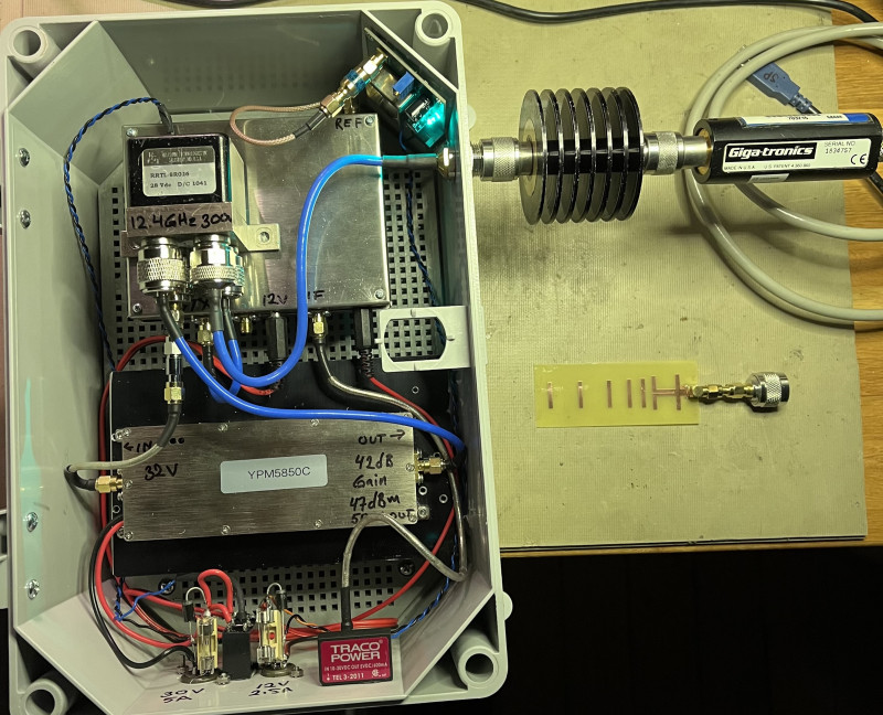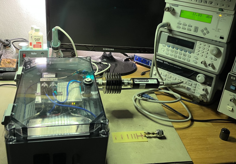 Well nowadays it is not really hard to find PA’s in the 50 =>100W range for 6cm. The one I found is the YPM5850C. It is a jammer for 5.8GHz drones. It is available on different sources on the net. The specification is 47dBm out with 42dB gain.