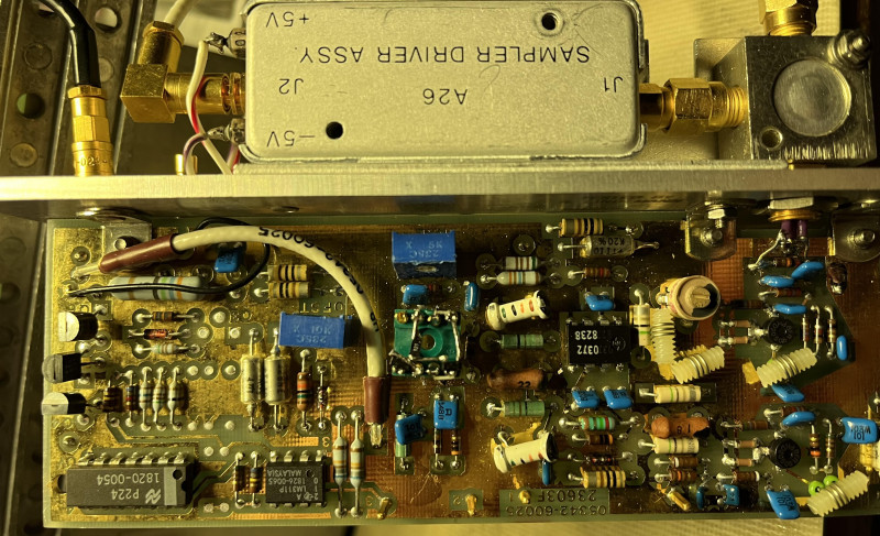But of course, sometimes it is the sampler that has a failure. A measurement at the A25 inlet from the sampler with a scope will tell if there is the high and low side from the sampler. Then out from the first BFR-90 amp => second BFR-amp and so on. There were more problems except the 1826-0372 present. I replaced 8 electrolytic capacitors on various places. One trimpot had a problem at the oscillator. Extra soldering was needed at the A25 pre-amp board. But actually, if I have replaced the 0372 first maybe that would fix it?